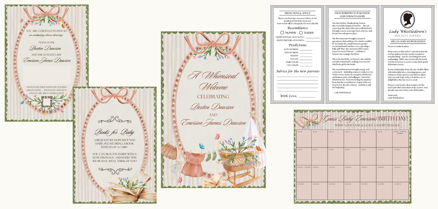 Once your theme is set, we bring it to life through cohesive, customized event pieces. Below are examples of invitations, signage, games, and other creative elements we’ve designed to match and elevate each unique event theme — proving that thoughtful details make all the difference.