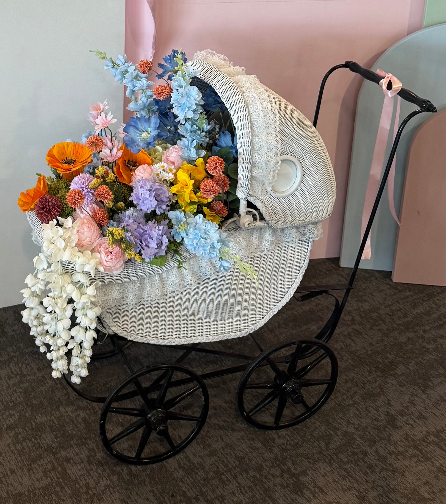 Sweet and nostalgic, this vintage carriage adds whimsy to any baby shower or display. Add your own florals or rent our styled faux arrangement.